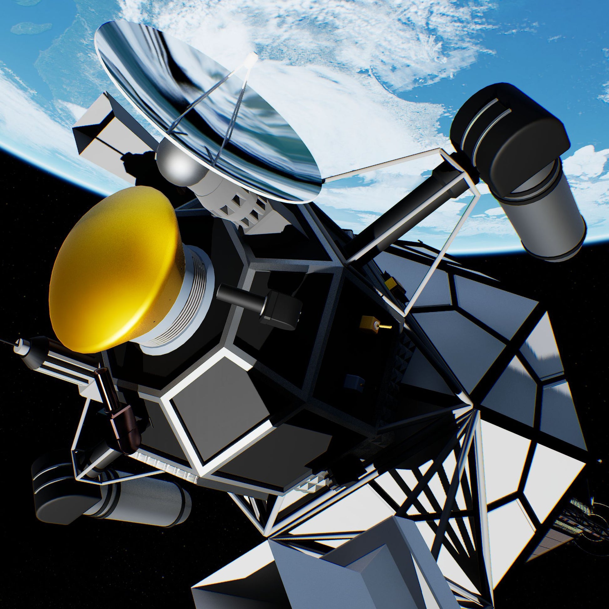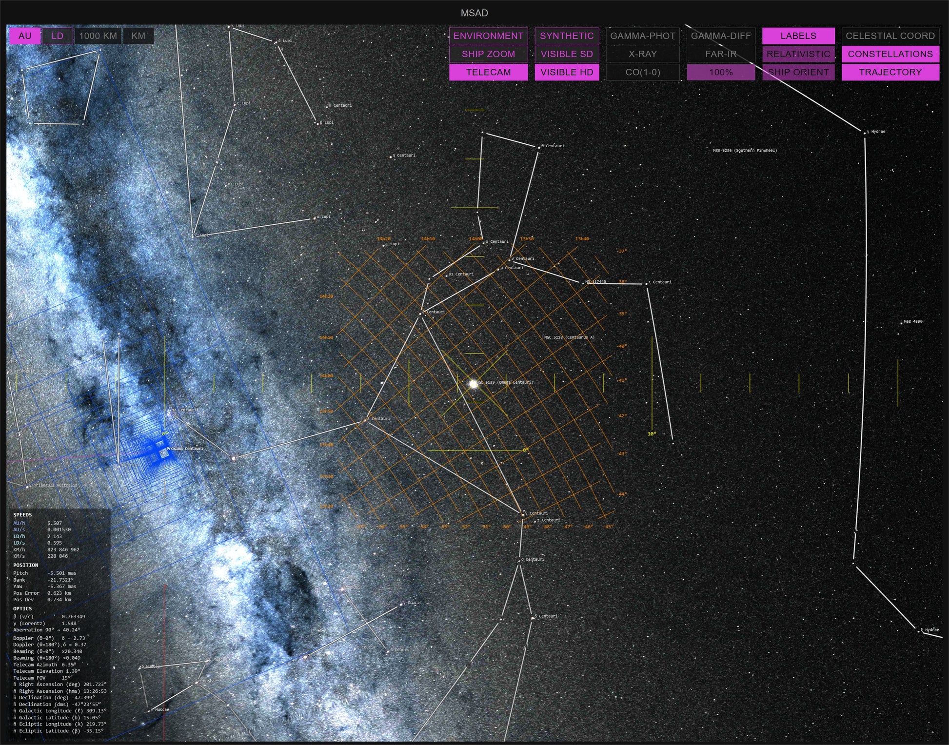 The display integrates catalogue-based stellar fields and multi-wavelength sky backgrounds with relativistic aberration and Doppler effects, enabling direct correlation between spacecraft motion, orientation, and observation geometry.